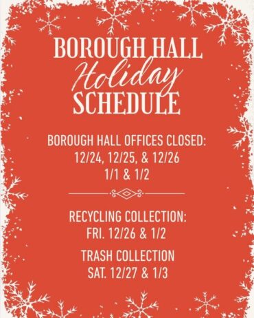 December 23, 2025Recycling and trash collection are both pushed one day, both this week and next week. Also the Borough Hall...