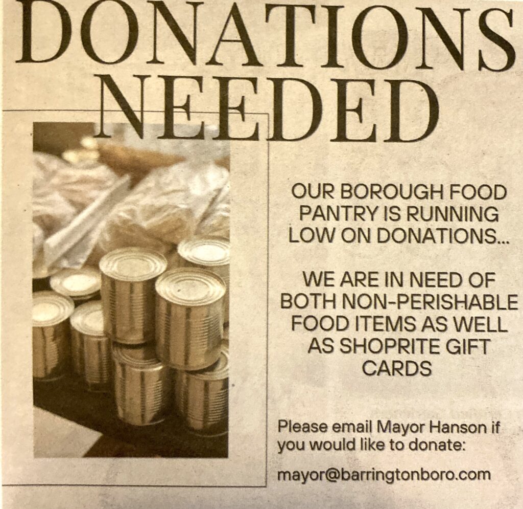 Food Pantry Donations Needed Food Pantry Donations Needed Leaf Collection Schedule 2025 NJ Amer. Water Replacing Lead Service Lines in Barrington – FREE Inspections Posted on September 1, 2025 in News and Events Please email Mayor Hanson if you would like to donate. Share this article: About SueBB
